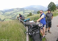 Švýcarsko: za Baulmes - čtvrtek 28. 6. 2007, den třetí, 8.15, tachák 8.796 km. Vstáváme, flek byl 10 km severozápadně od Neuchatelského jezera. V noci se z Petrova stanu ozývalo vzdychání a převalování, asi se trápil kvůli ztrátě telefonu. Ráno mobil našel v kabelce na řidítkách, do který se asi 3krát večer koukal, blbec. Vaříme kuskus, čaj a kafe. Vyrážet jsme chtěli co nejdříve, ale nedařilo se, zatím jsme se před 8. nevyhrabali. Po úbočí Jury sjezd k městu Neuschatel, vesničky a příjemná krajina, vinice, pěstují tu prý výborná vína, která se nedají koupit nikde jinde než jen ve Švýcarsku, domu jsem ale žádné nedovezl. S kolem kolem jezera to je horší, jezdí tu moc aut a vše je něčí, nebo někoho, třeba zrovna ten Schumacher z F1 tu má baráček, ale vedle silnice vedou zpravidla cyklostezky. Ve městě nákup v samoobsluze. Na oběd jsme si zajeli na nábřeží jezera, kde jsme nákup zčásti zlikvidovali. Na Bern jsme frčeli mezi polema se zeleninou, žádná krása to nebyla a Petr zase píchal, pro jistotu přední kolo, to poprvé, před tím to byly jen zadní. Trochu sem se naštval, protože jsem mu dal už druhou duši, kterou při výměně zase urval u ventilku, jako tu první. Steky sem s ní šlehnul do lesa, no ani sem ji po svém uklidnění nemohl sebrat, protože se zachytla na větev stromu, asi tam visí dosud, pardon. Na mapě je ve městě Kerzers vyznačená cykloopravna, tak jsme tam jeli. Byly tam 2, jedna normál, druhá kamarádštější, asi jako u Johnyho v Ústí, ale větší a samozřejmě dražší. Petr mi koupil novou duši za 11,- frantíků, ale při pozdějším defektu mi jí stejně vzal. Je programově hodný chaosář, když mu třeba po ubalení cigarety řeknu, jestli nemá zapalovač, protože nevím, kde ho mám a jsem pohodlný ho hledat, tak se se slovy ‘to víš že jo Mílo’ začne plácat po kapsách a koukat do kabelky na řidítkách, skoro vždy ho našel na posledním místě a ochotně kámošovi zapálil. Tím mě, jestli mi rozumíte, zároveň ponížil… za mojí pohodlnou neomalenost i lenost. Večer se dohadujeme kvůli místu na spaní, a to nejen dneska, důvod sváru to byl většinou. Petrovi to bylo asi jedno, nikdy nic, co byl s námi (nevím proč), nekomentoval. Dominik říkal, že mu je to jedno, ale asi mu to jedno nebylo, chtěl mít věci na noc připravený co nejdřív a babrat se s fotkami, vařičem nebo mokrýma hadry. Jirka - podřizuje se většině, buď je hodně veselý, nebo hodně kyselý, ale do 2 hodin se zprůměrňuje a je to OK. Já furt jen hledám rovinu s více pod hlavou. Dneska byl Jirka i já šťastný, les za loukou, večer vlahý, rovina s více pod hlavou a zázrakem - bez deště. Petr stavěl stan, my jsme šli na ‘dobrodrůžo’ pod širák. Únava, vaření, od chlapů sem měl gulášovou polévku s bagetou (přežil jsem to). Pěkný večer, flek, povídání, 5 km před Bernem. Ujeto 98 km. Nastoupané metry nestojí za řeč.